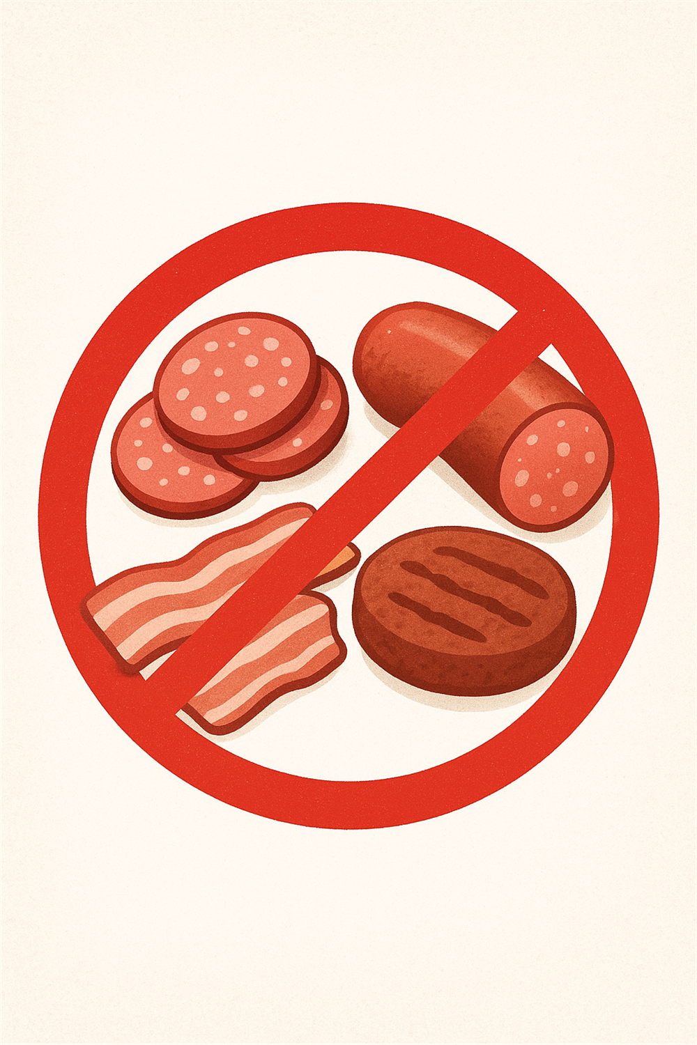 اللحوم المُصنّعة تحتوي على مواد حافظة مثل النتريت والنترات، وهي مواد مرتبطة بزيادة خطر الإصابة بـ السرطان 🧪.